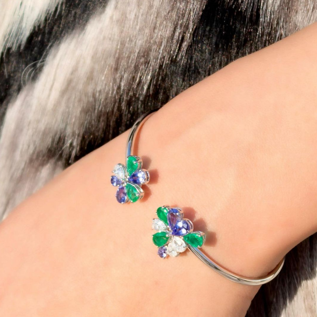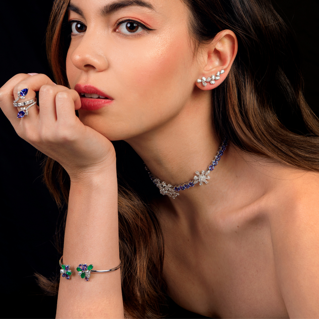 Set with G+ Colour, VVS/VS clarity Natural Diamonds, Natural Green Emeralds and Natural Blue Tanzanites