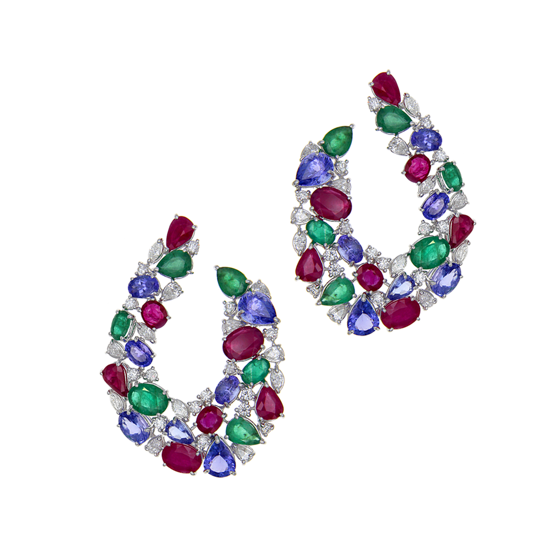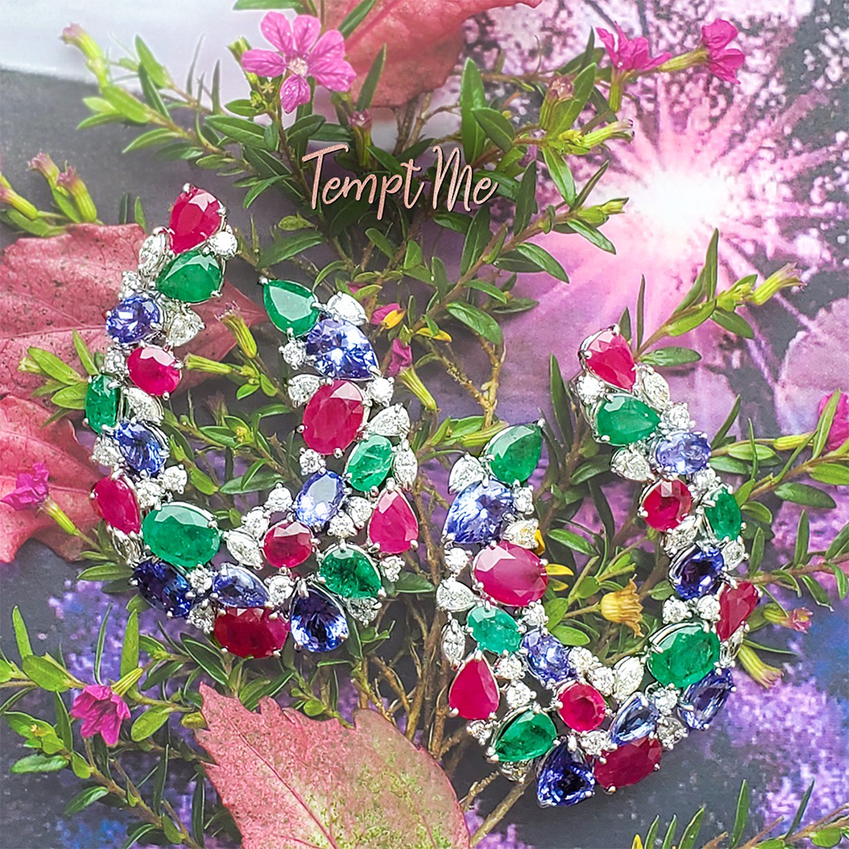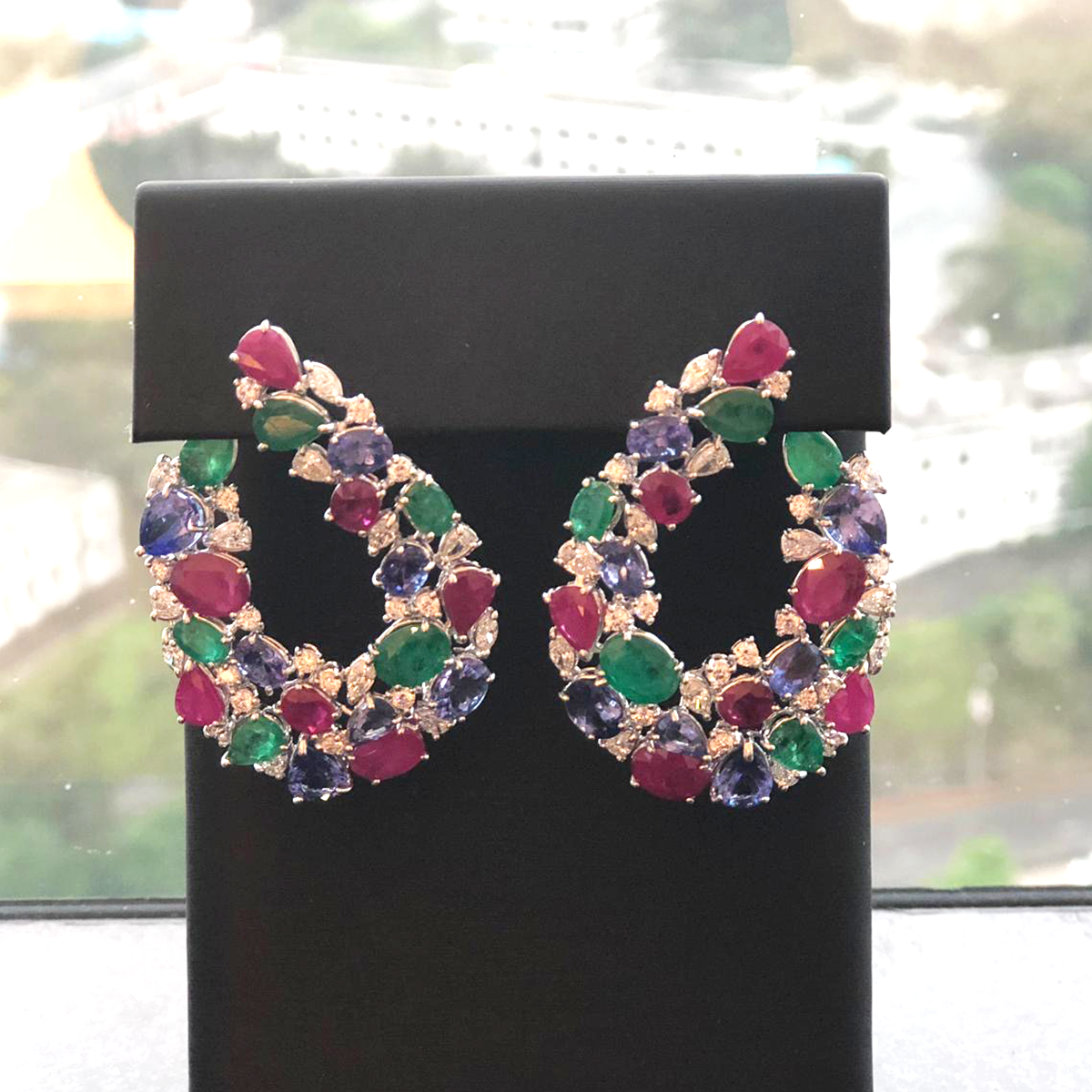 Diamond, Ruby, Tanzanite and Emerald Earrings Handcrafted in Hong Kong with 18K White Gold